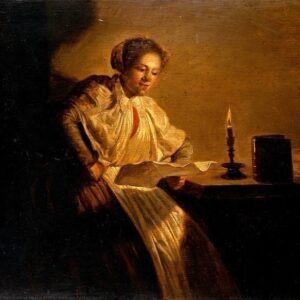 Woman reading by candlelight