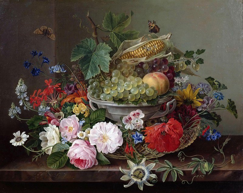 / Flower still life with fruit basket